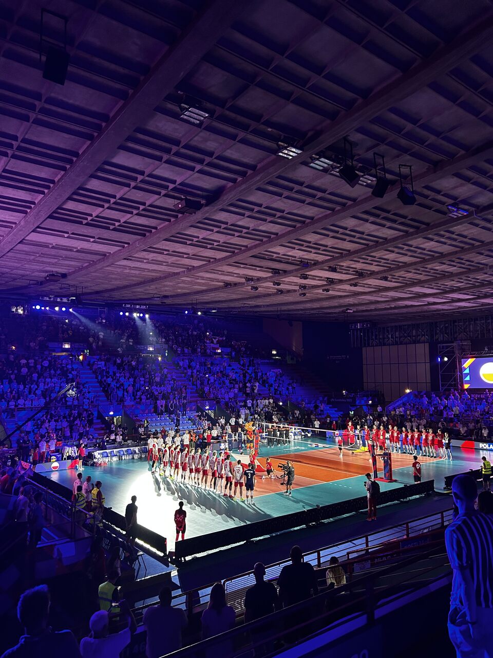 O ile w dniu meczu Włochów hala była pełna, to lwia część kibiców została także na kolejne spotkanie. Co prawda w niedzielę frekwencja była niższa, ale nadal całkiem spora. Sprzedały się miejsca głównie na wyższych trybunach. Pomimo tego, że kibiców było mniej, to bawili się równie dobrze. Może wyrażę trochę niepopularną opinię, ale bawili się nawet lepiej niż w niektórych meczach w Polsce. DJ i spiker zadbali o odpowiednią i nowoczesną playlistę, która naprawdę dobrze pasowała do tego, co działo się na boisku. Do składu na parkiecie również, bowiem hit polskiego disco polo “Miód malina” wybrzmiał kilka razy w głośnikach.