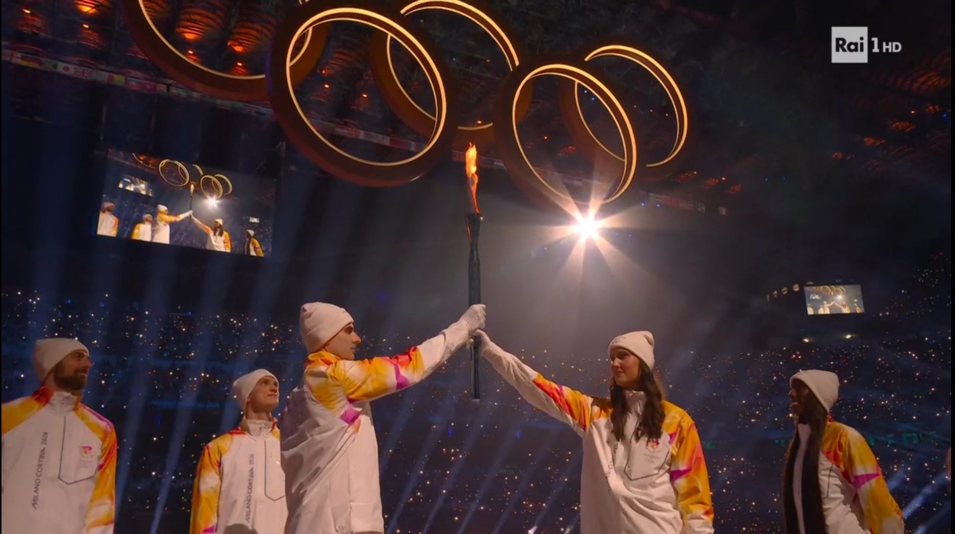 Pierwszy znicz zapłoną przy Arco della Pace, a więc słynnym Łuku Pokoju. Dokonał tego Albero Tombie, trzykrotny indywidualny mistrz olimpijski w narciarstwie alpejskim oraz Deborah Compagnonii, będąca również trzykrotną mistrzynią w tej samej dyscyplinie. Drugi znicz zapalono natomiast na Piazza Dibona w Cortinie d’Ampezzo i szansę zapalenia go otrzymała Sofia Goggia, mistrzyni olimpijska z Pjongczangu w zjeździe.